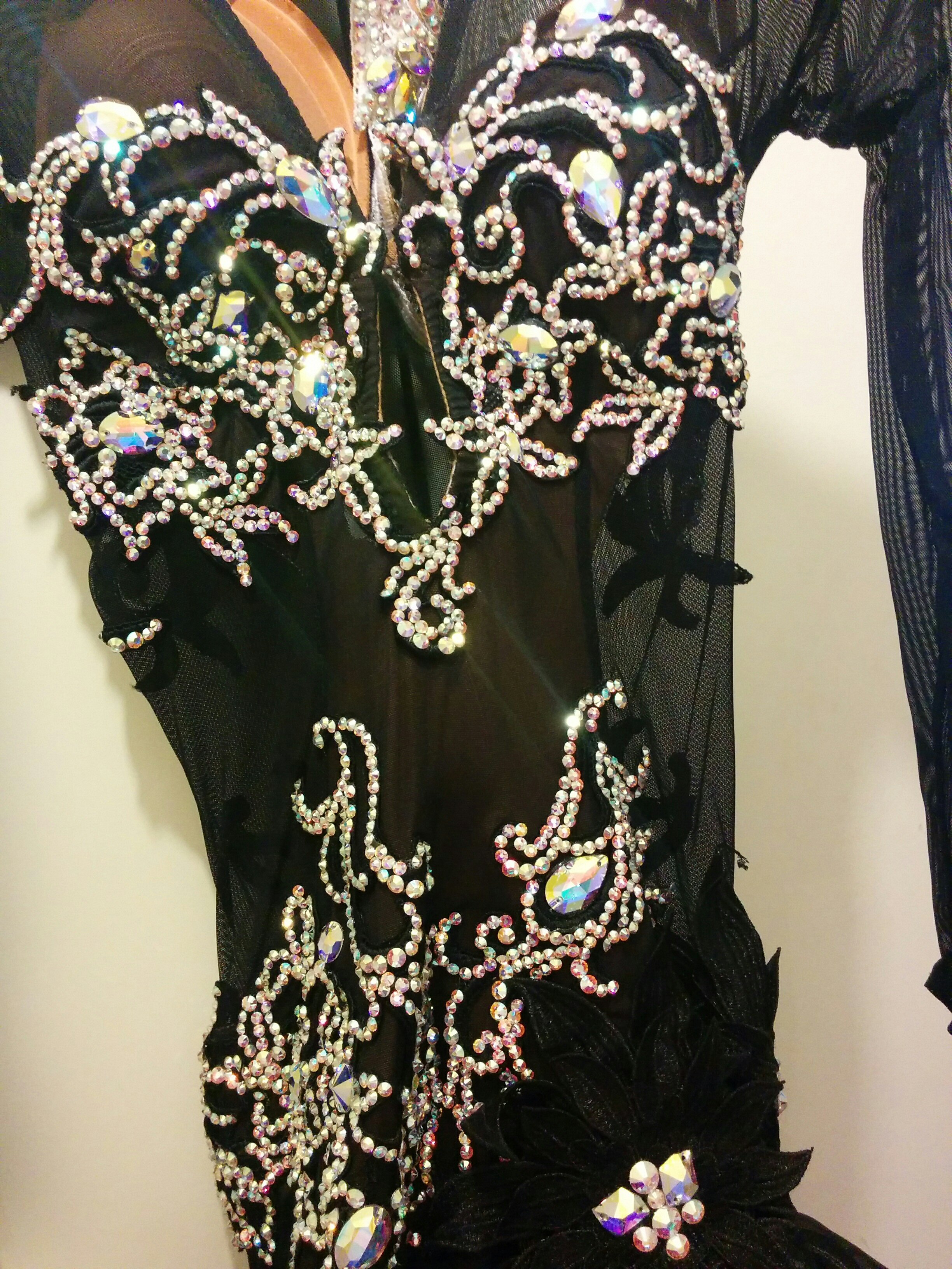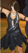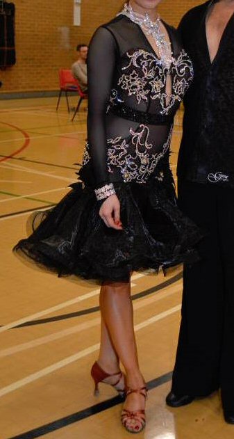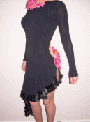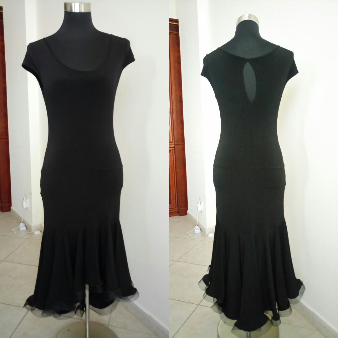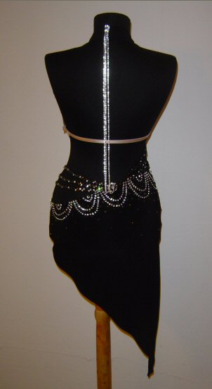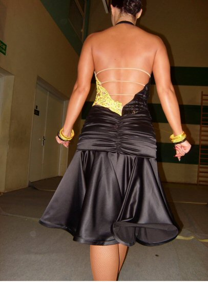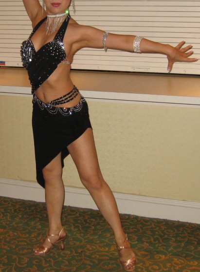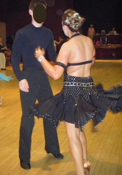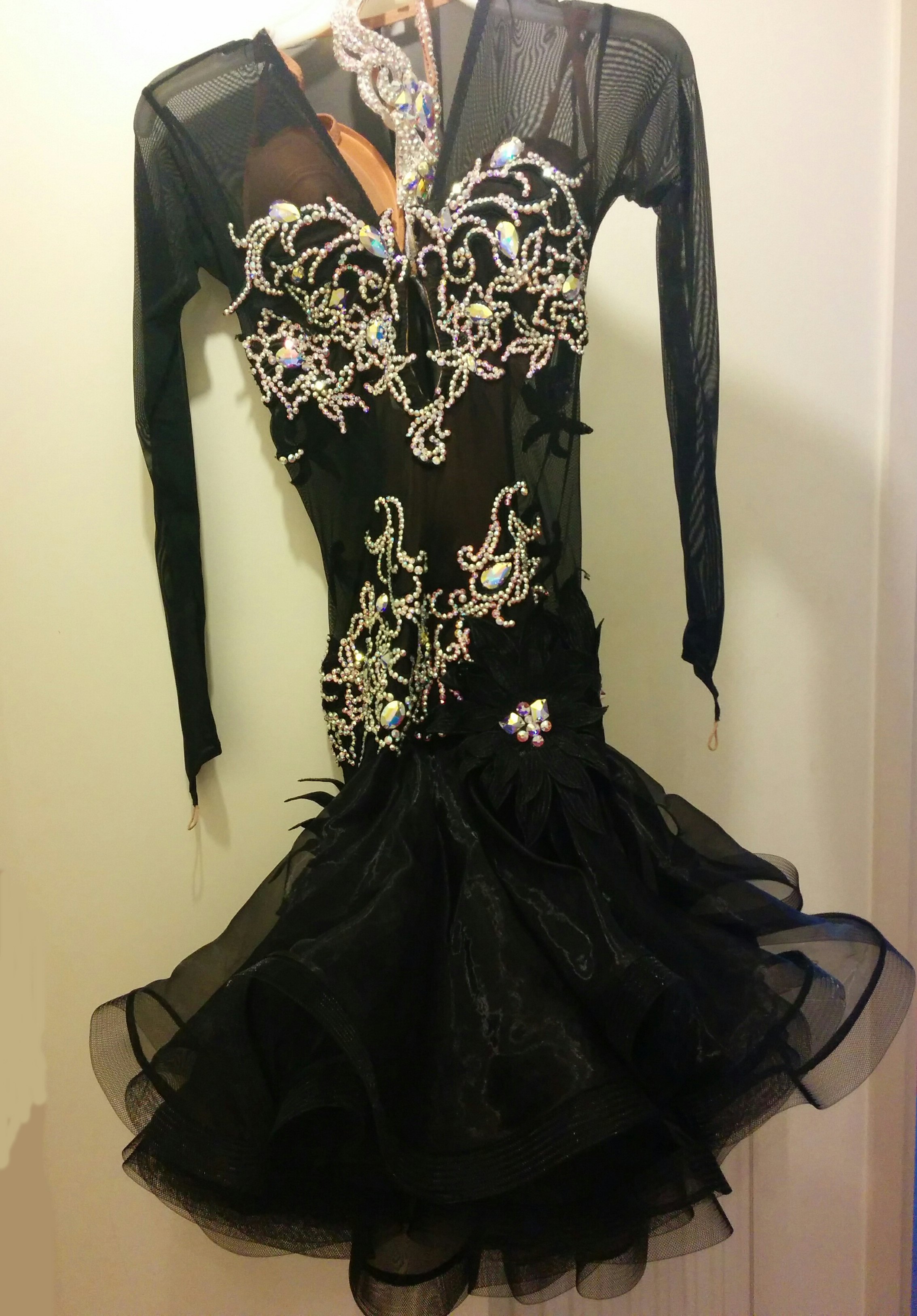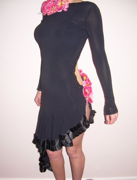 A very sleek, sexy black Latin dress, custom made by a professional dress maker.