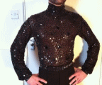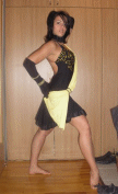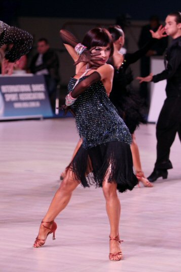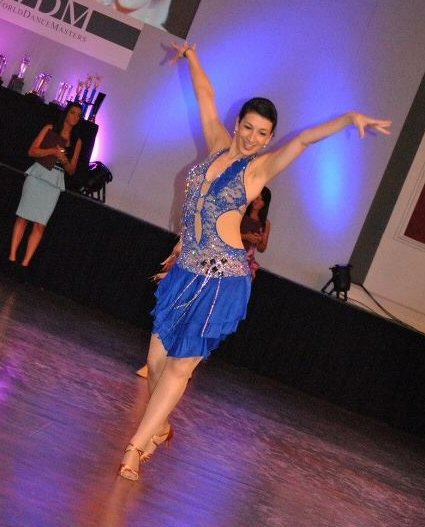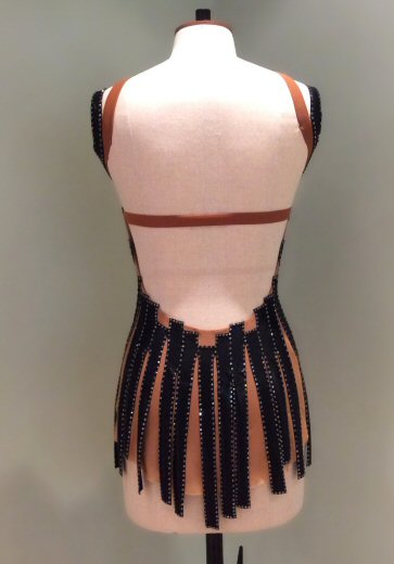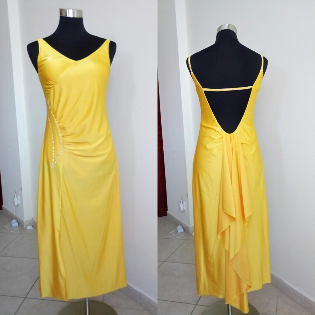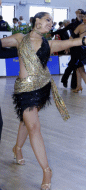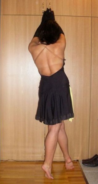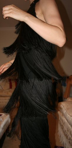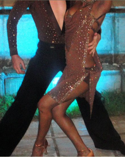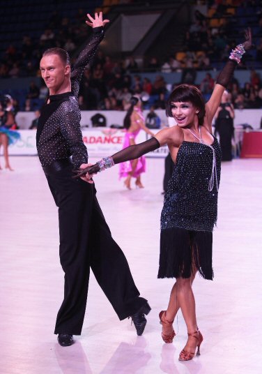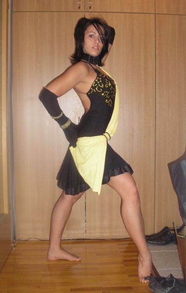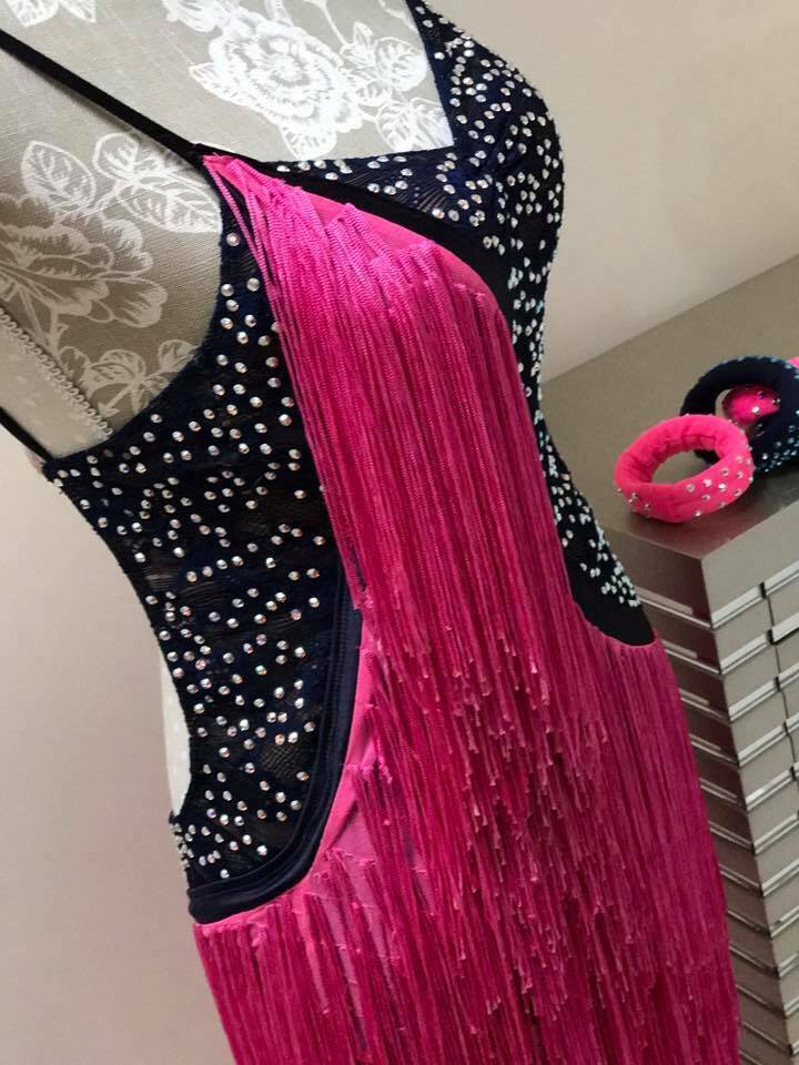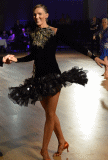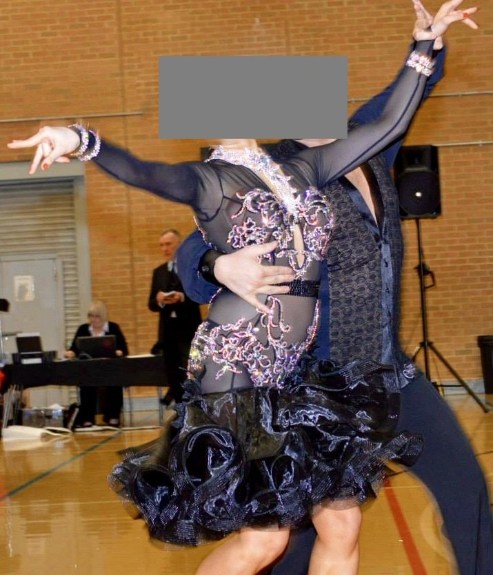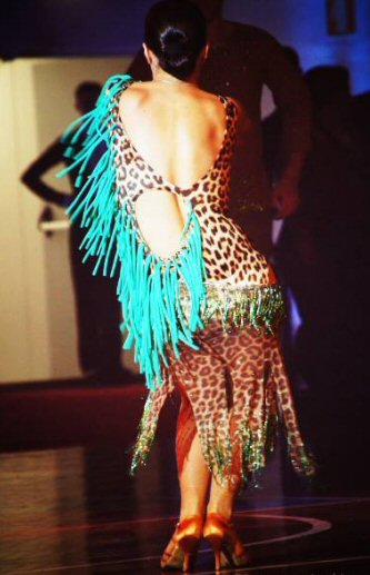 A very sleek, sexy black Latin dress, custom made by a professional dress maker.