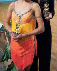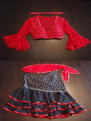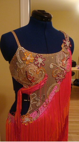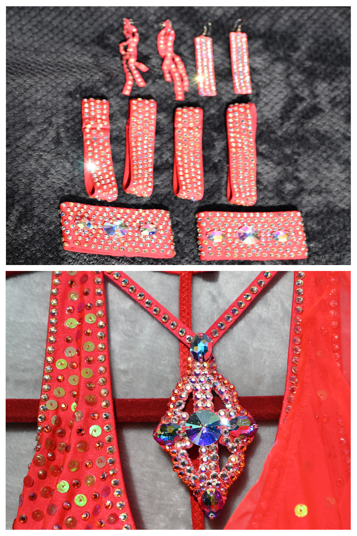 Gorgeous latin dress that moves great! Beautiful necklace, bracelets, and gloves included as well.