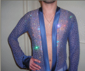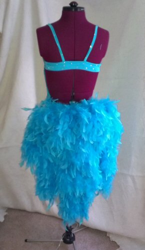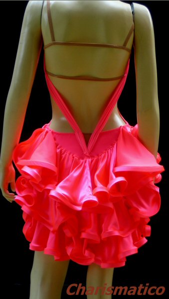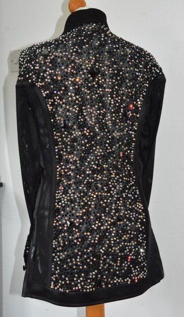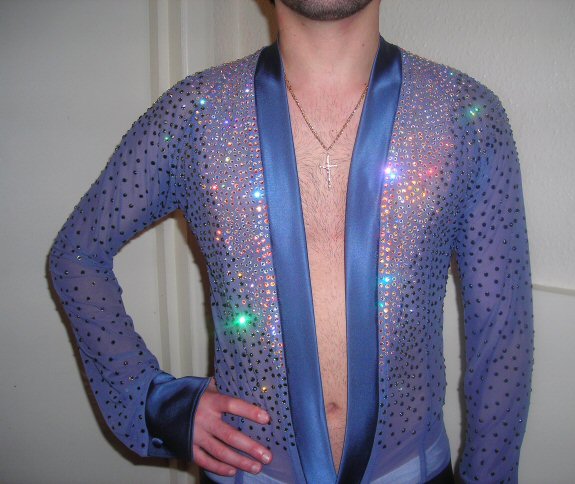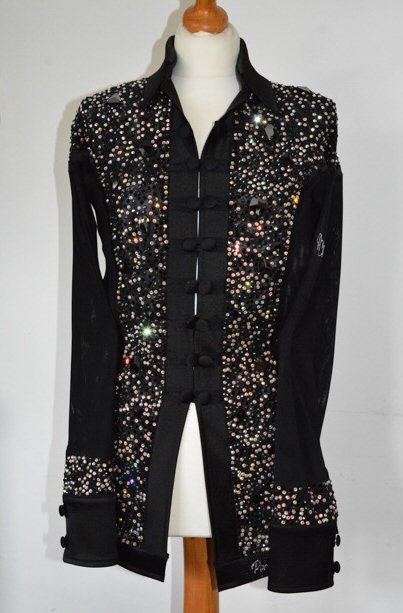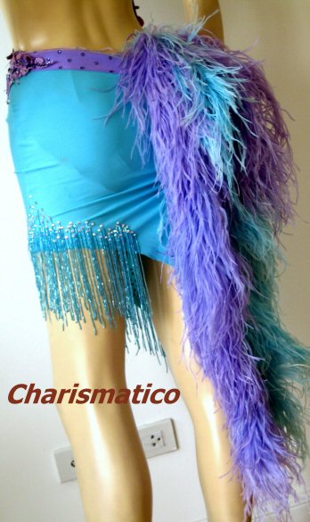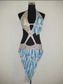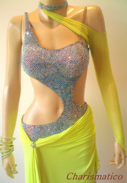 Latin top is off the shoulder,clasp at the back, low cut out back completly stoned with Swarovski