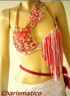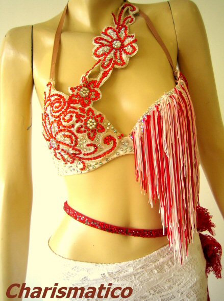 With metallic beaded sequin fringes on a right bra cup, stoned drape, and rhinestone chains