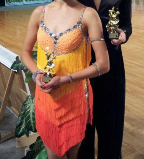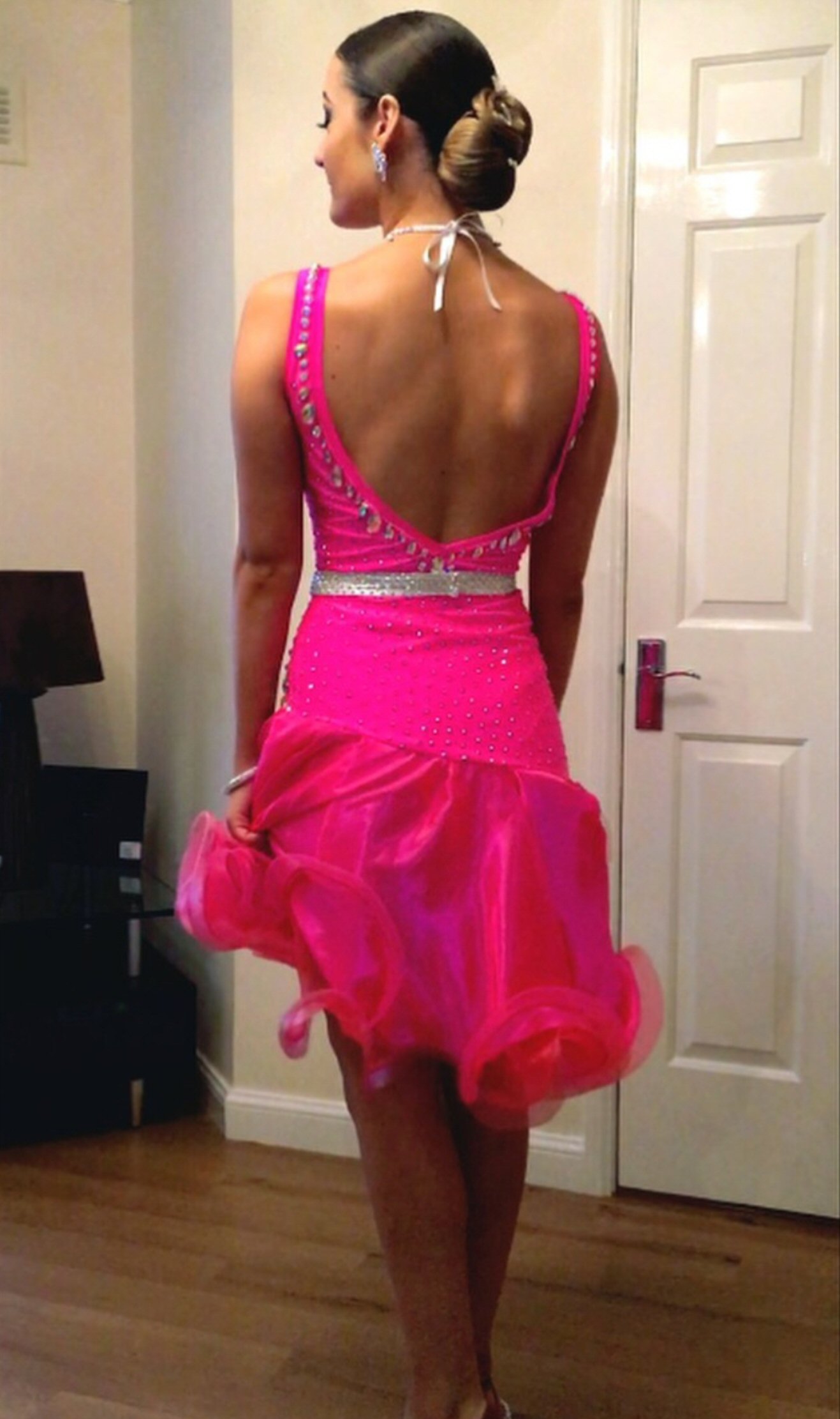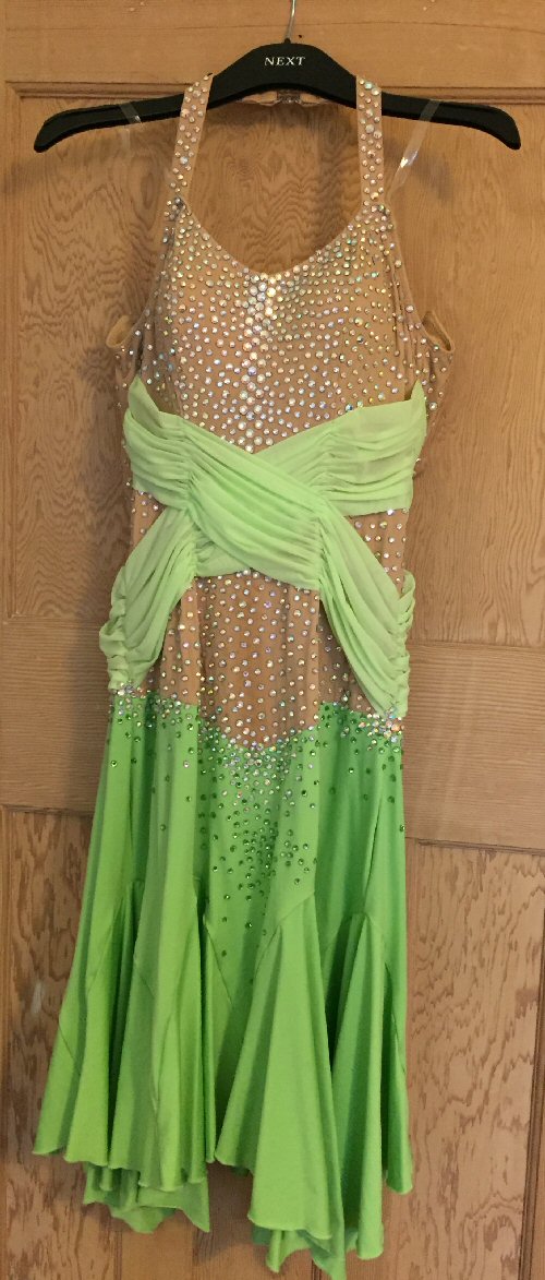 Whilst wearing this dress the owner was placed 7th in Pre-Champ Latin at Champions of Tomorrow, Blackpool. Contact details - natasha.m.filer@gmail.com / (+44) 07902215418 Price - £400 or best offer Front view | Action shot | Front view | Back view |
