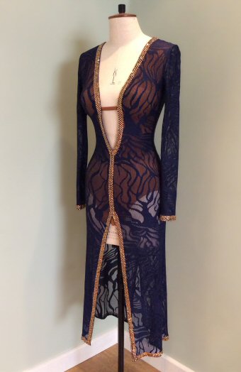leotard with belt and lace necklace. V shaped neckline and open back. Side split in thigh