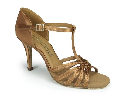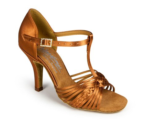 Classic five-strap T-Bar design, featuring unique and intricate back design with eye-cataching cut-outs. Ultra flexible. Lightweight. Gel padding for lightweight cushioned support. Made in England. The picture shows Tan satin, 3" Elite heel.