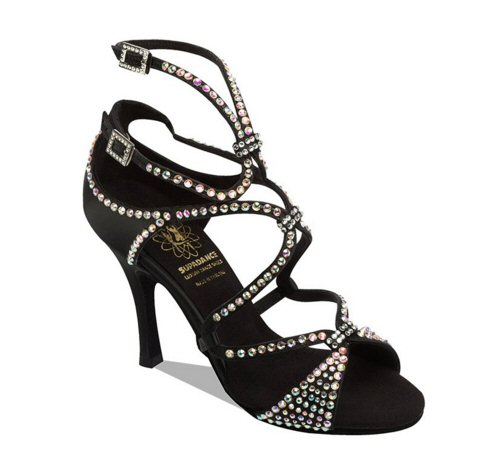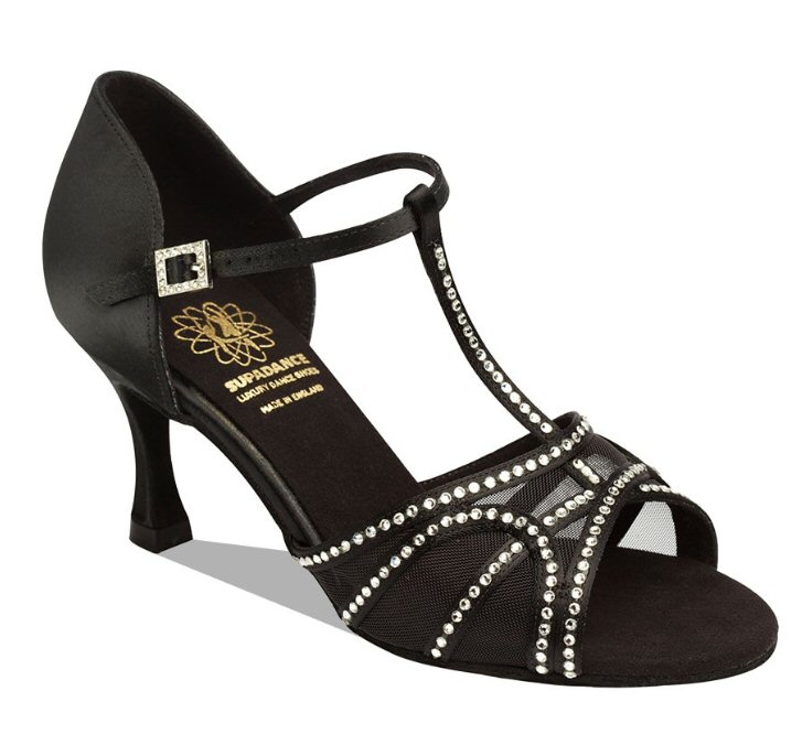 Style 1541 Black satin Price £125.00 excl.VAT Multi strap and Mesh sandal with Swarovski crystals. Square Diamond Hook Buckle. 2.5" flare heel. |