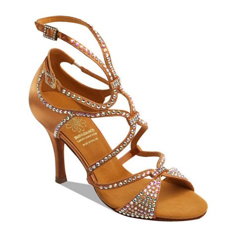 Style 1071 Dark Tan satin Price £115.00 excl.VAT Multi strap sandal with Swarovski crystals in Dark Tan Satin. Square Crystal Hook Buckle. Choice of 2.5" flare or 3" stiletto heel. |