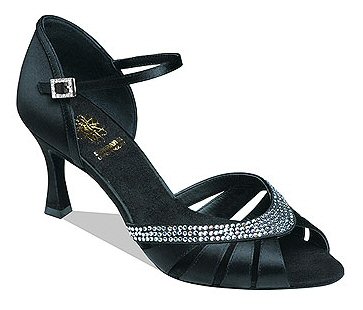 Style 1542 Black satin Price £125.00 excl.VAT With Genuine Swarovski Crystals. Square Diamond Hook Buckle. 2.5" flare heel. |