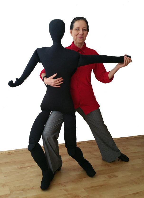 Handy Parter is a soft doll with a heigth of an average female ( 5ft 5in) weighting approx 1.5kg. Its legs bend in hips and in the knees. It allows you to practice your dance moves with a body in the absence of a real partner, but it can also be a useful prop even if you do have a partner.