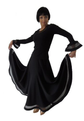 Magnificent flow ballroom skirt made of four panels and finished with mesh. Body friendly stretch crepe. Very easy care: Machine washable, dries quickly and does not require iroining. Does not crease.