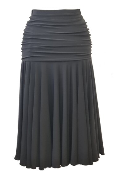 Eight panel, bell shape practice skirt made in stretch crepe with elasticated waist.
