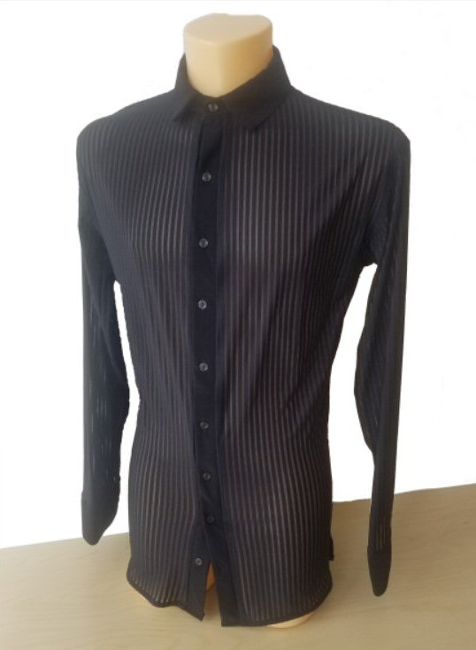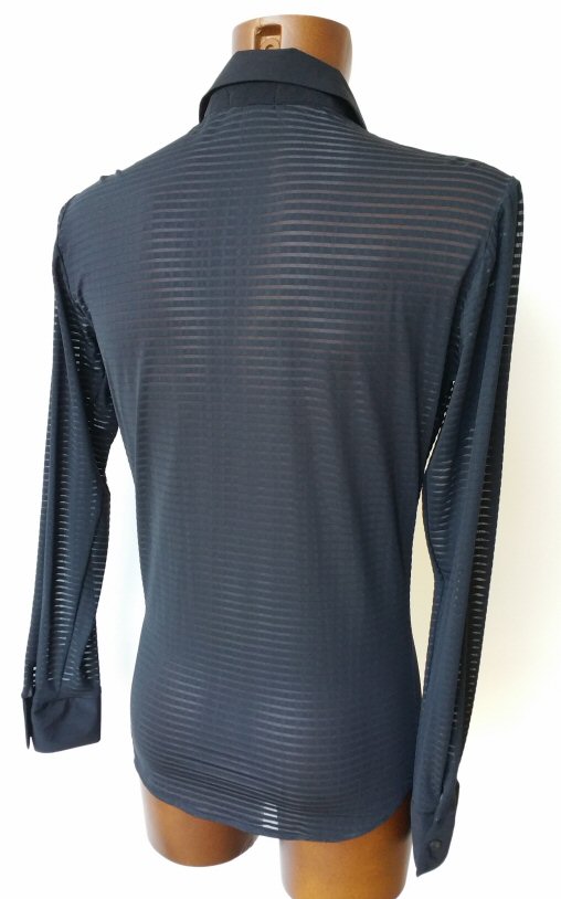 Semi-see through stripe fabric on the sleeves, the back and body sides. Solid black stretch crepe on the front. Traditional collar, buttons and button cuffs. The collar size goes in proportion with the body size and it is slightly larger, but this type of shirt is best worn with top button open, so you do not need an exact collar size. This is a shirt only, no underpants built-in.