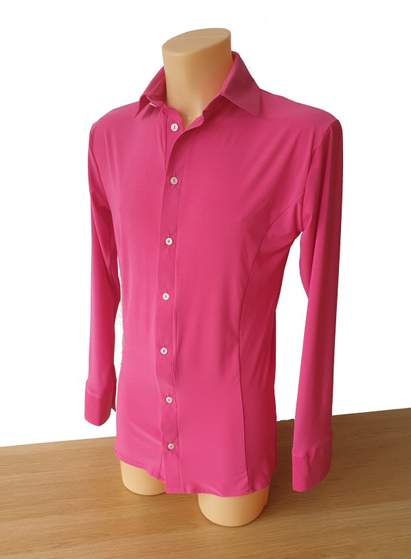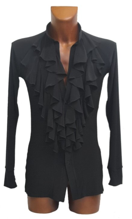 Rich front frills are the signature of this trendy Latin shirt. The buttons can be left open for a sexy look or done up for more conservative look. Made of stretchy jersey, this is a shirt that can be worn outside the trousers. Available in all colours shown on the sampler, can also be custom made to your measurements.