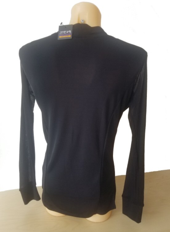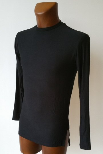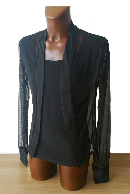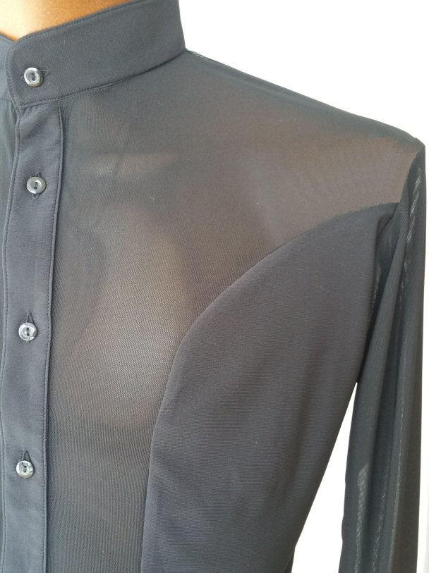 Very trendy combination of stretch black mesh and plain black two way stretch jersey. With slits on sides and small stand-up collar. The shirt has been photographed on a dark "skin" plastic mannequin, therefore the mesh areas seem darker than in reality, but if you wear it on a lighter skin tone they will look lighter.