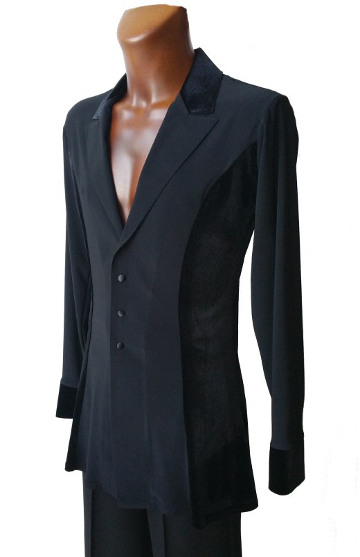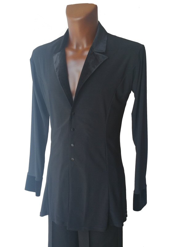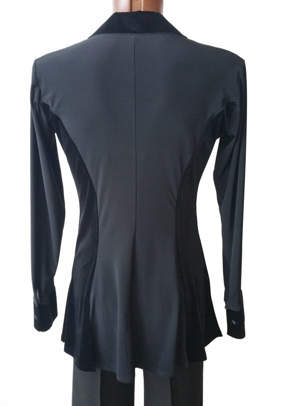 Jacket style Shirt gives you a smart look like a jacket and is light to wear like a shirt. Made in stretch crepe and stretch velvet makes it easily adjustable to your body moves. Flared hem line with slits allows the hem to move freely as you spin adding impact to your moves. The collar and cuffs are finished with the same velvet as the sides. Satin covered buttons complete the perfect look.