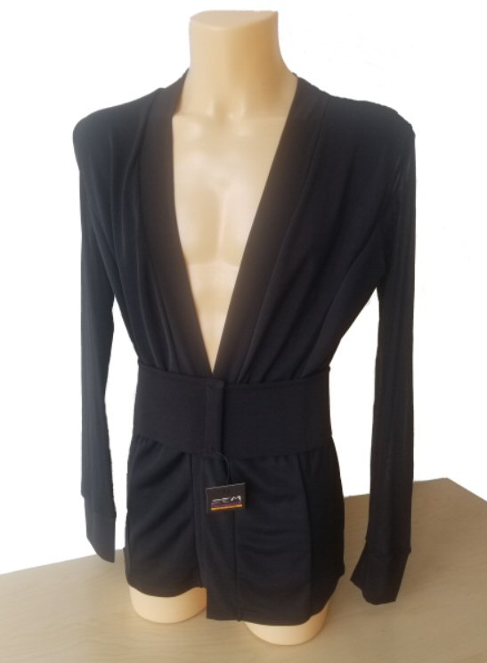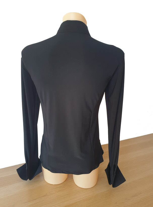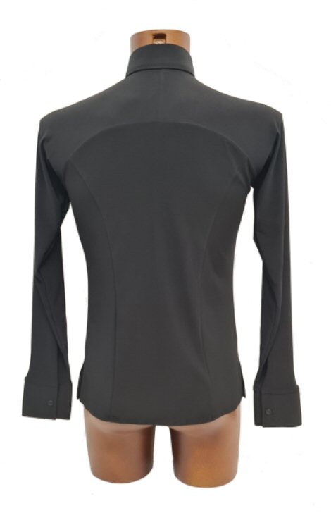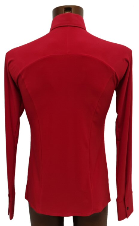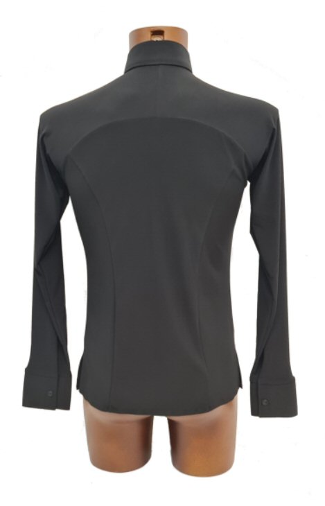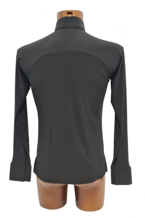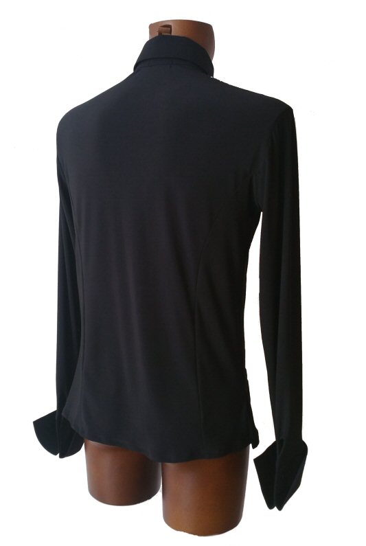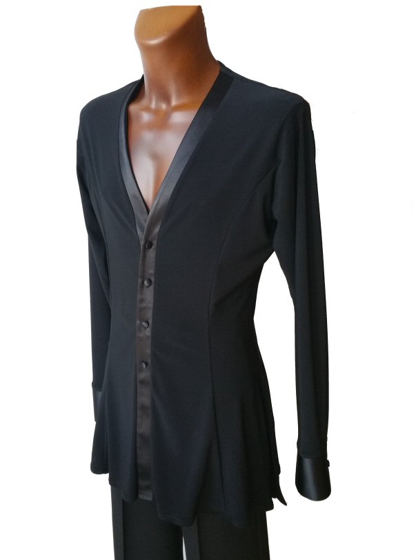 This Jacket style Shirt is more contemporary design than the above, but it also gives you a very smart look and is light to wear like a shirt. Made in stretch crepe with high quality satin edging it easily adjusts to your body moves. Flared hem line with slits allows the hem to move freely as you spin adding impact to your moves. The collar and cuffs are finished with high quality satin. Satin covered buttons and detachable satin back detail complete the perfect look.