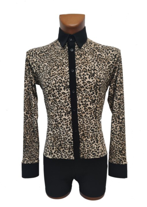 Very soft, two way stretch crepe. The shirt is built on shorts, so it will never pull out from your trousers. Buttons behind a front pleat. Long sleeve is finished with a single cuff with button. Short sleeve is finished with Animal print edging. We also have a plain Black or White version of this shirt |