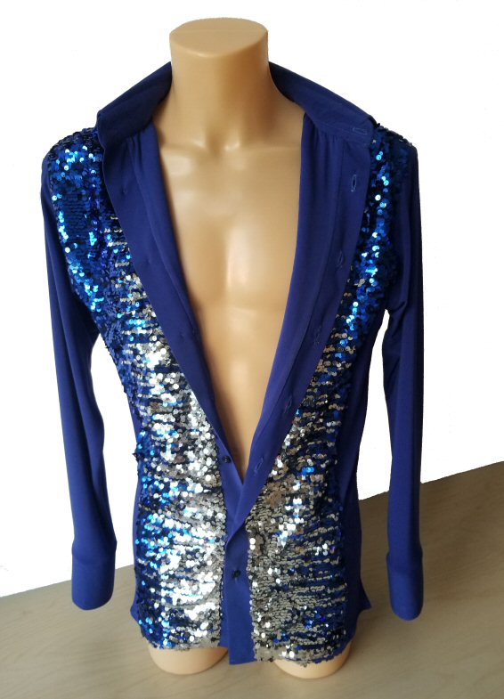 Soft, two way stretch crepe shirt with shiny sequin at the front. Traditional collar and buttons. This is a shirt only, with no underpants. Under the sequin fabric there is a lining of soft jersey, so it will not irritate your skin. Available from Xtra Small to Xtra Large, but it can also be Custom made to your size. Just select "custom size" in the size selection box and send us your measurements: collar size, chest size, waist size, length of sleeve measured from armpit to wrist.