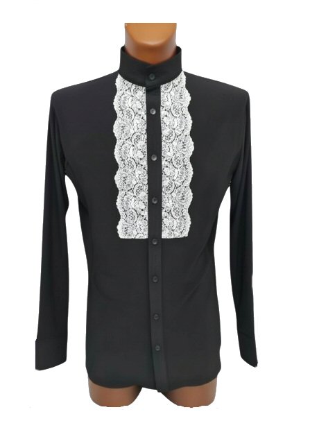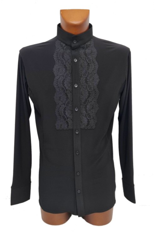 Stretchy Flamenco style shirt with lace front. Single cuff with button. The shirt on the photo is shown with a standup collar, but we can also make it with a traditional collar. Machine washable, dries quickly and does not require ironing.