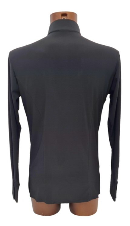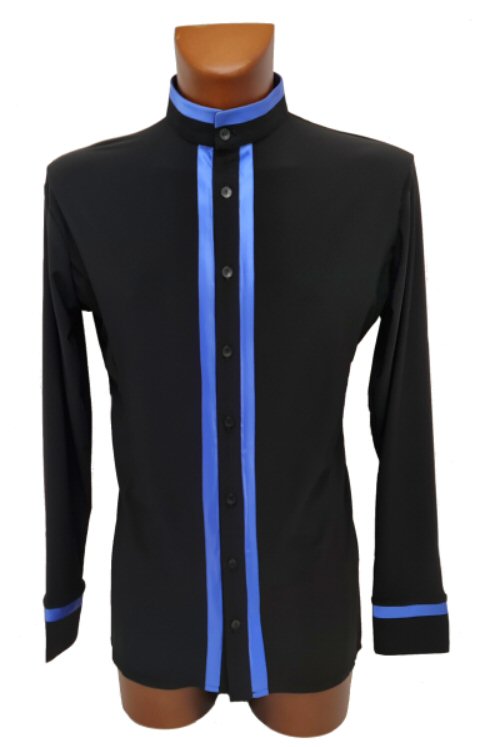 Cool shirt for Latin or show dance with contrasting satin trim. Button fastening. Single cuff with button. Easy care: Machine washable, dries quickly and does not require ironing.
