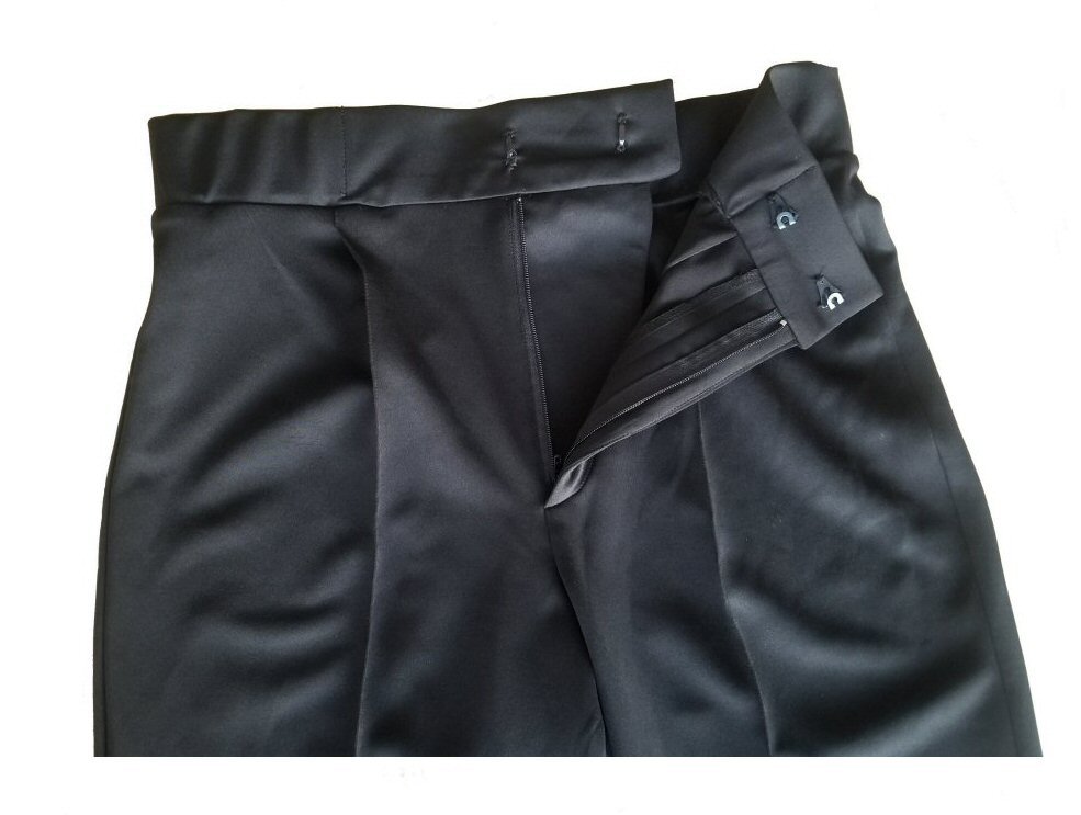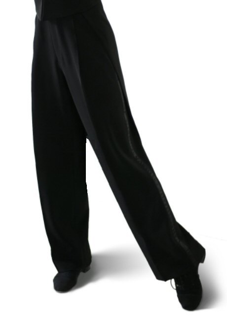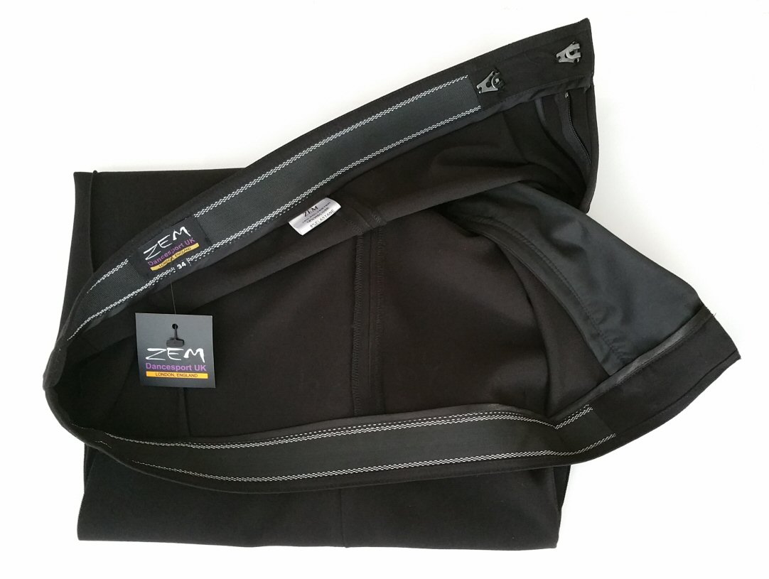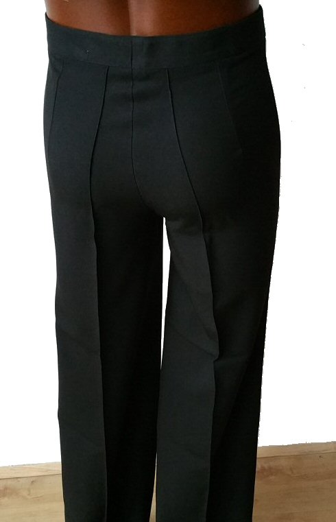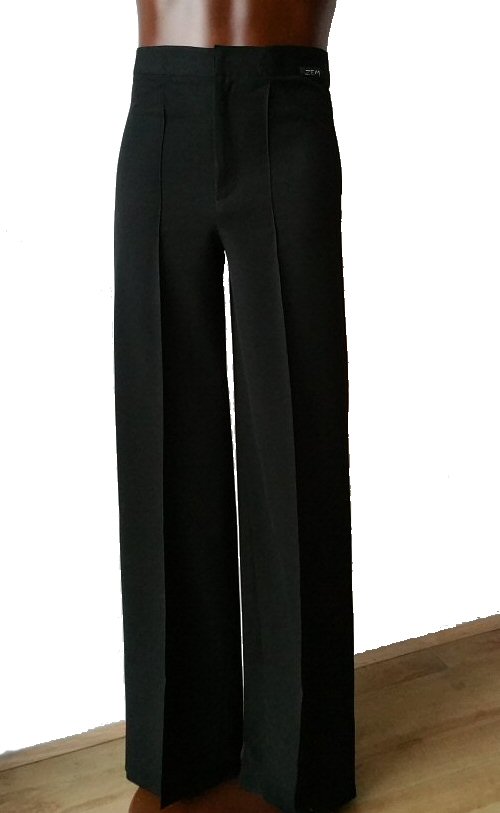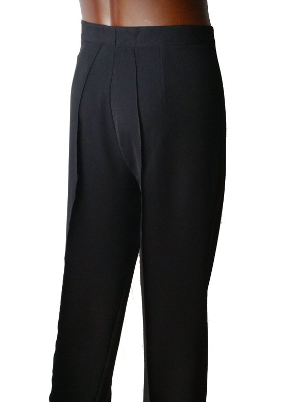 Latin trousers have no pleats at waist level, are more fitted in the upper leg than Ballroom trousers. Triple reinforced seams.