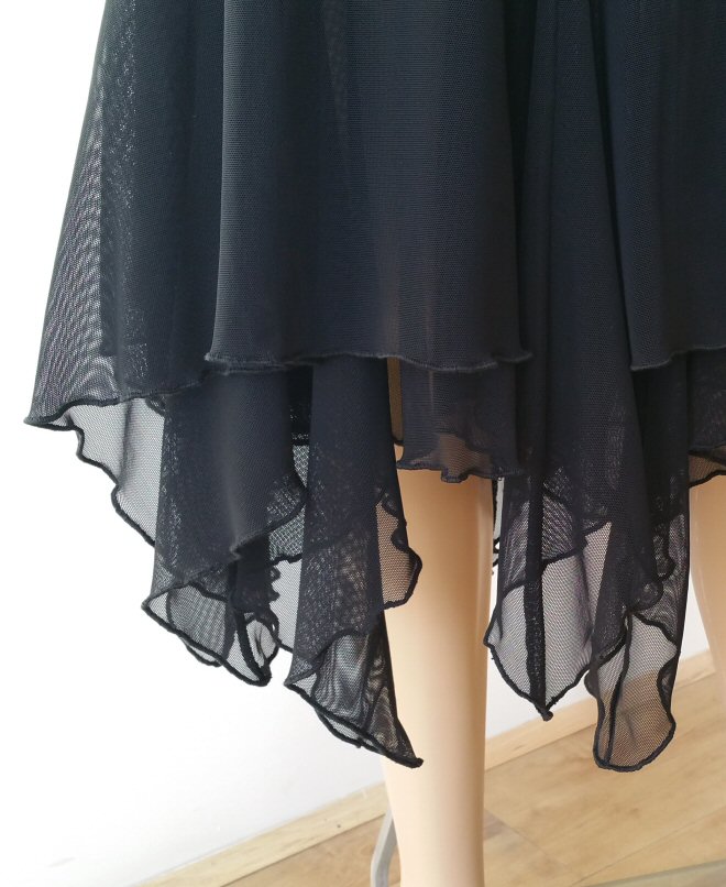 Magnificent flow ballroom skirt made of four panels and finished with mesh. Body friendly stretch crepe. Very easy care: Machine washable, dries quickly and does not require iroining. Does not crease.