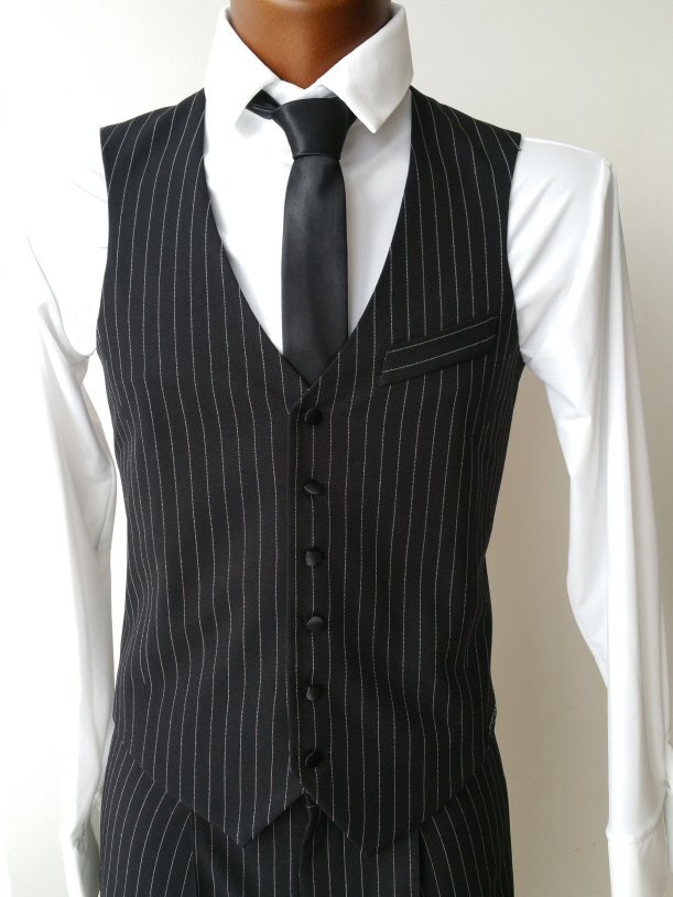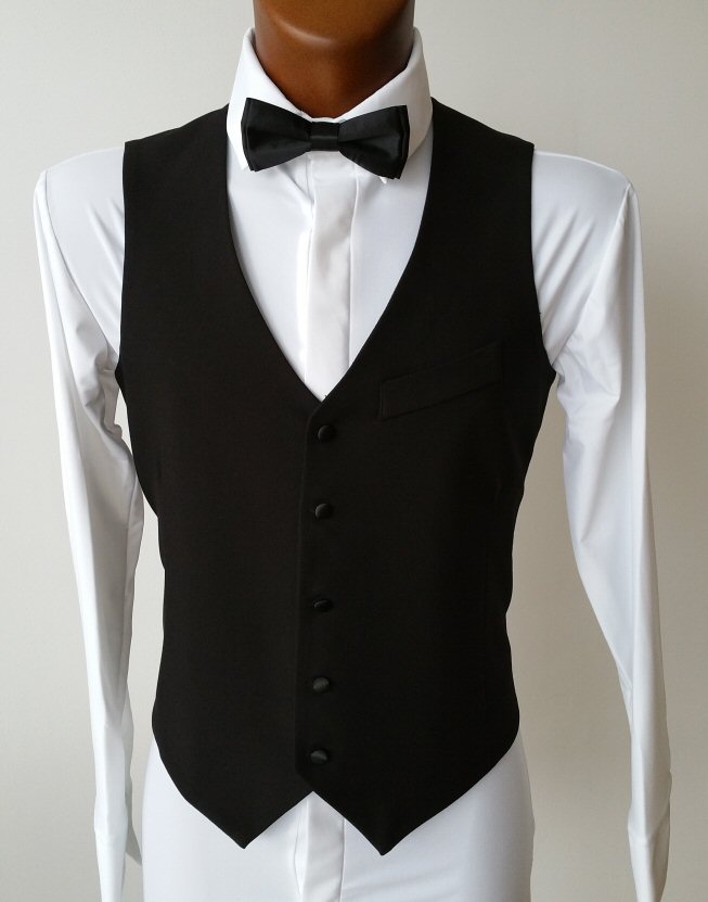 The front of this waistcoat is made from the same fabric as our E-MTR102 Ballroom/Latin trousers. Satin lapel at front in traditional jacket style. Fake pocket on the left side. Black only.
