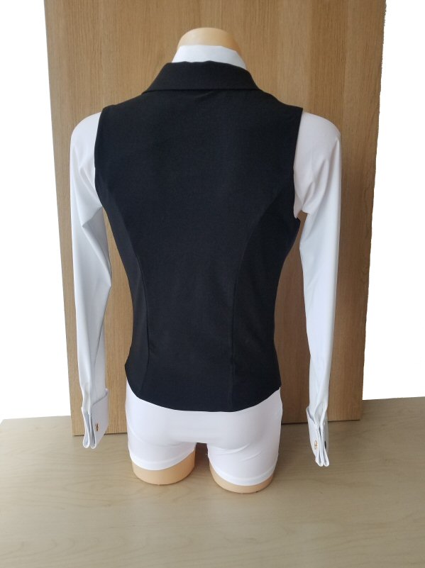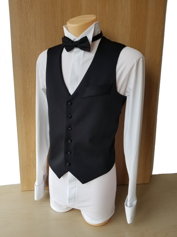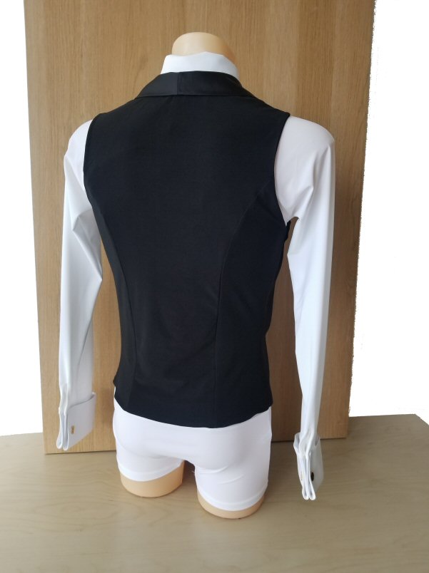 This long line waistcoat can be called a "jacket without sleeves". It is made from the same fabric as our E-MTR102 Ballroom/Latin trousers and finished with satin at front. Fake pocket on the left side. Unlike previous waistcoats it is made from the traditional trousers fabric on front and back, therefore not elastic.