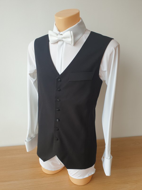 The front of this waistcoat is made from the same fabric as our E-MTR102 Ballroom/Latin trousers. Satin lapel at front in traditional smoking style. Fake pocket on the left side. Black only.