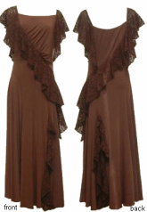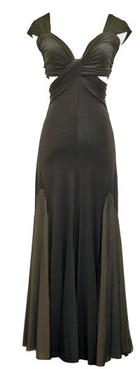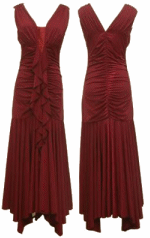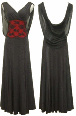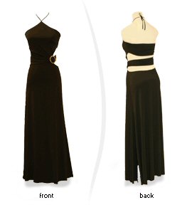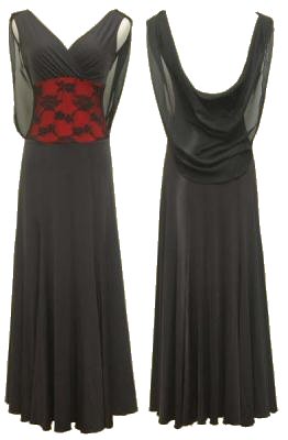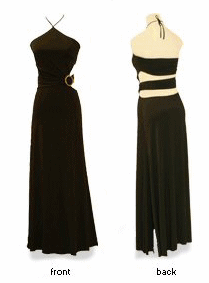 Criss cross at front, bare back. The dress has two see-through flesh net inserts in the top layer on both sides. The underlaying layer is of the same colour as the main body of the dress, eg. black or red. Length from shoulder top to hem 126cm (50 inch).