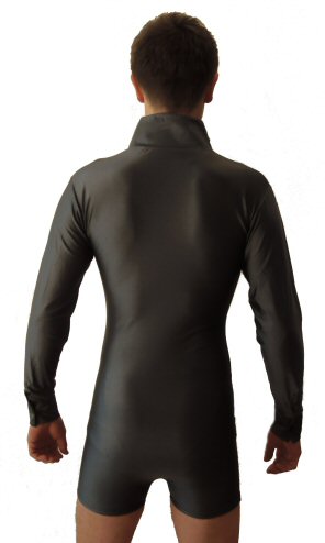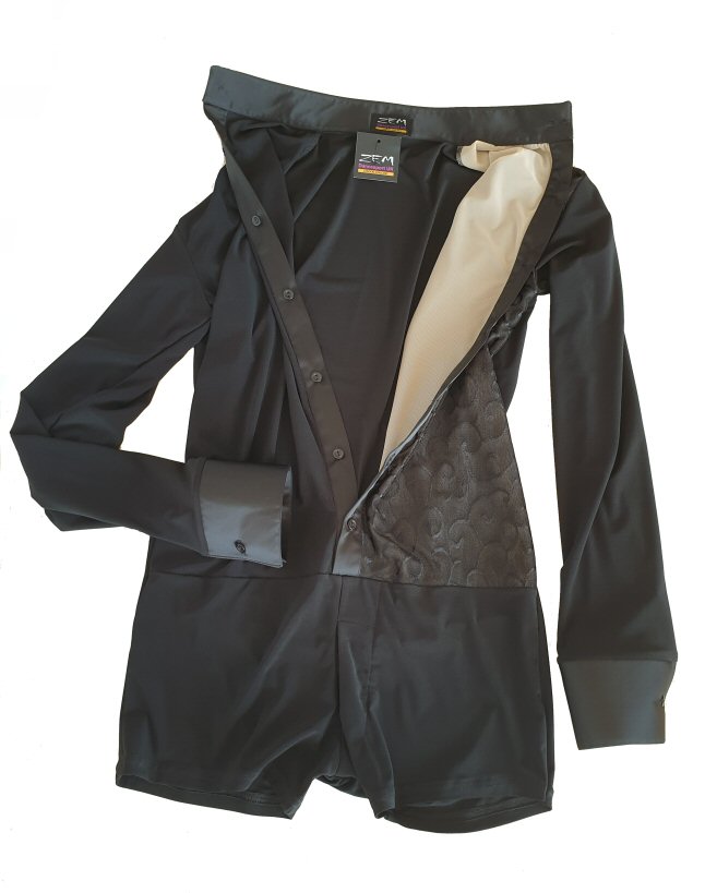 Body shirt built on shorts with zip and unique black/silver motif around the front line. Machine washable. |