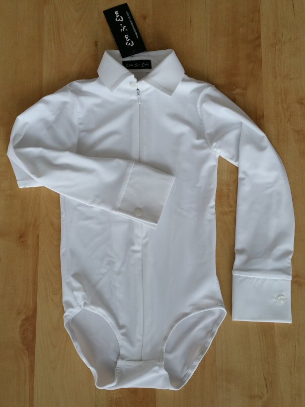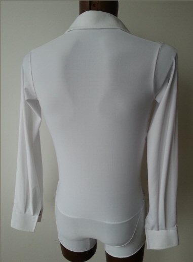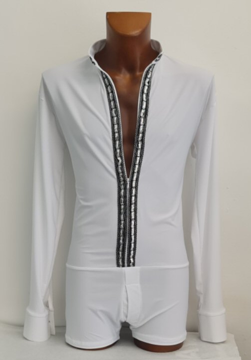 Stretchy Latin body shirt with Zip and black/silver trim, White, XL 42 inch chest, 17in collar