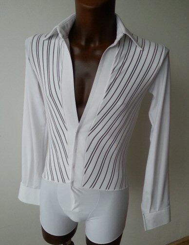 Macho stripe Stretch Latin comp. body shirt with Zip, Black jersey/satin, Large 40 inch chest