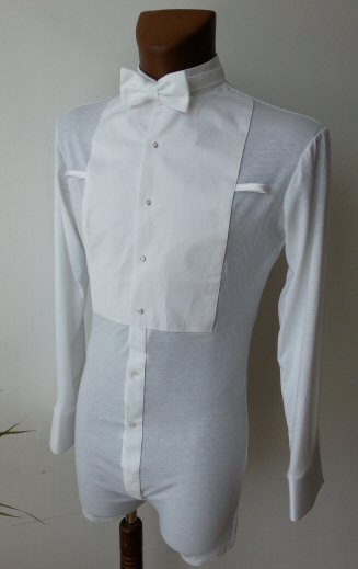 Black shirt with White satin trim, size XL: Collar 17.5", Chest 42-44", Waist 38-40", Length 30"