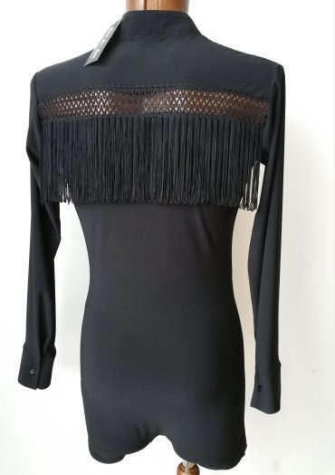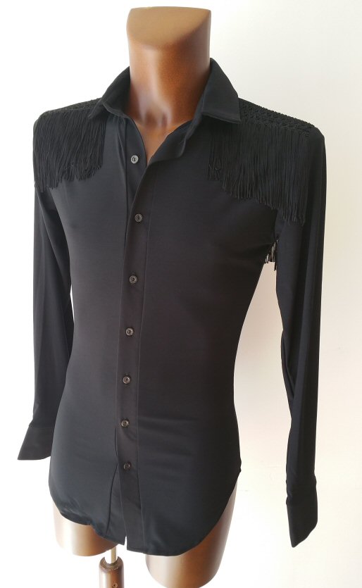 Mens Black Fringe Latin shirt with buttons, Black, Small (Chest 36-38" / 91-96cm) with 2" stretch