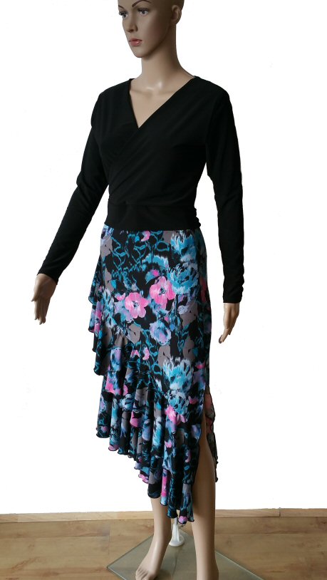 Sequin front Raglan Latin shirt on shorts, Black, Small/Medium, Collar 15.5 inch, Chest 36-38 inch, Waist 34-36 inch