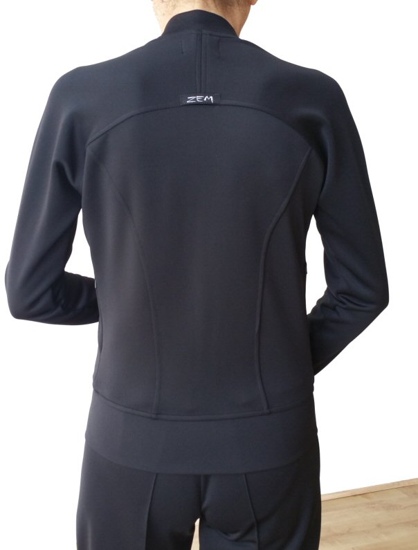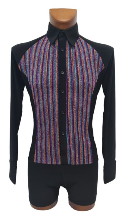 Macho stripe Stretch Latin comp. body shirt with Zip, Black jersey/velvet, Large 40 inch chest