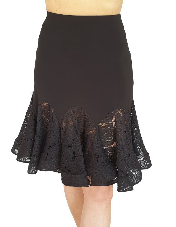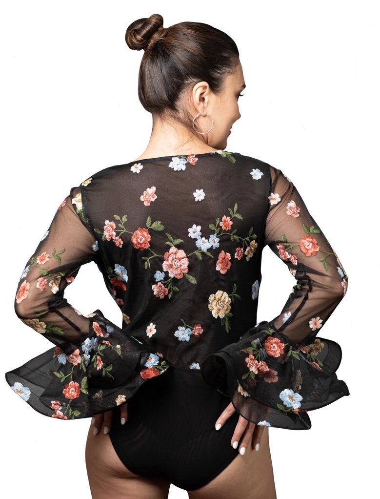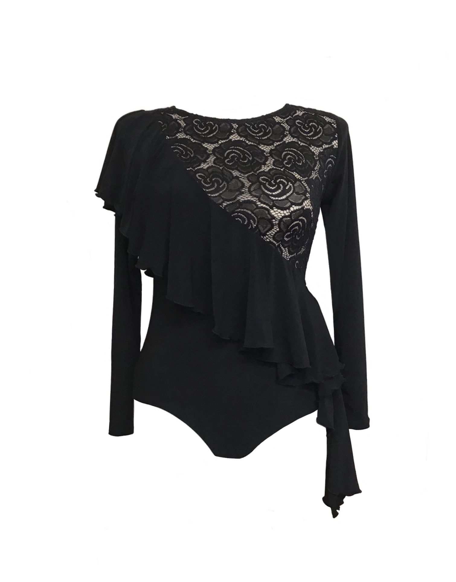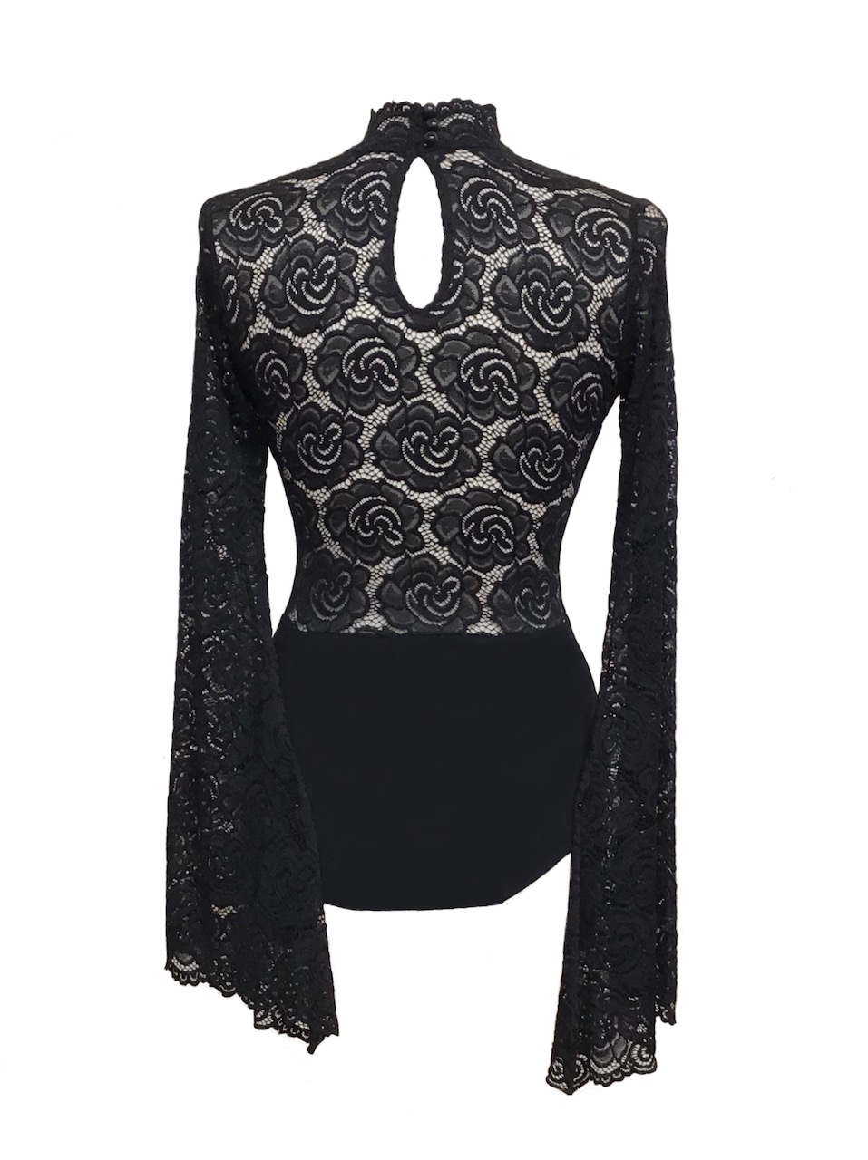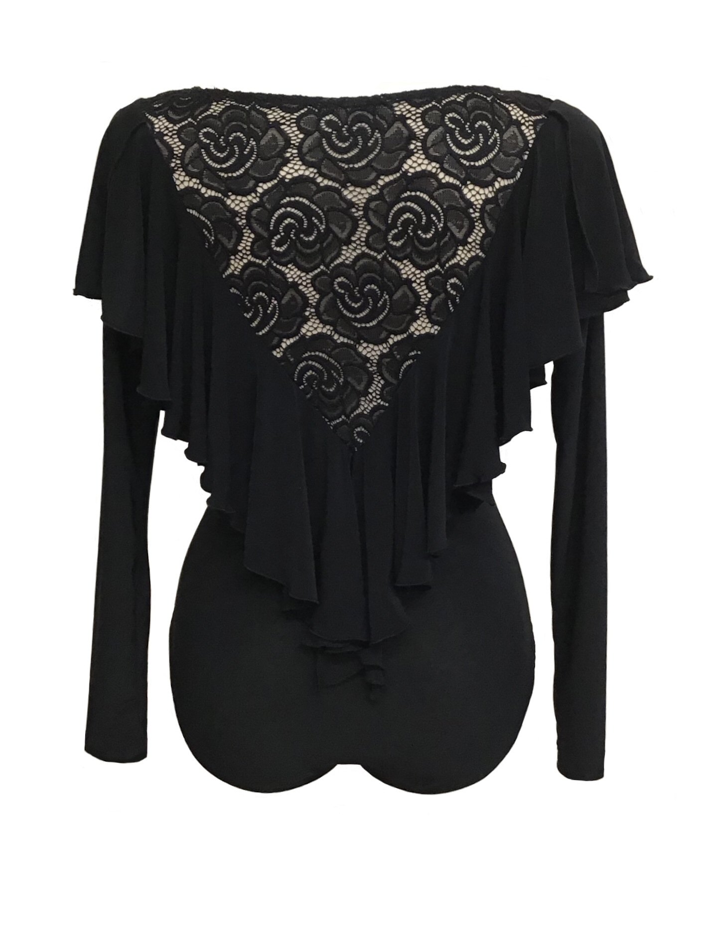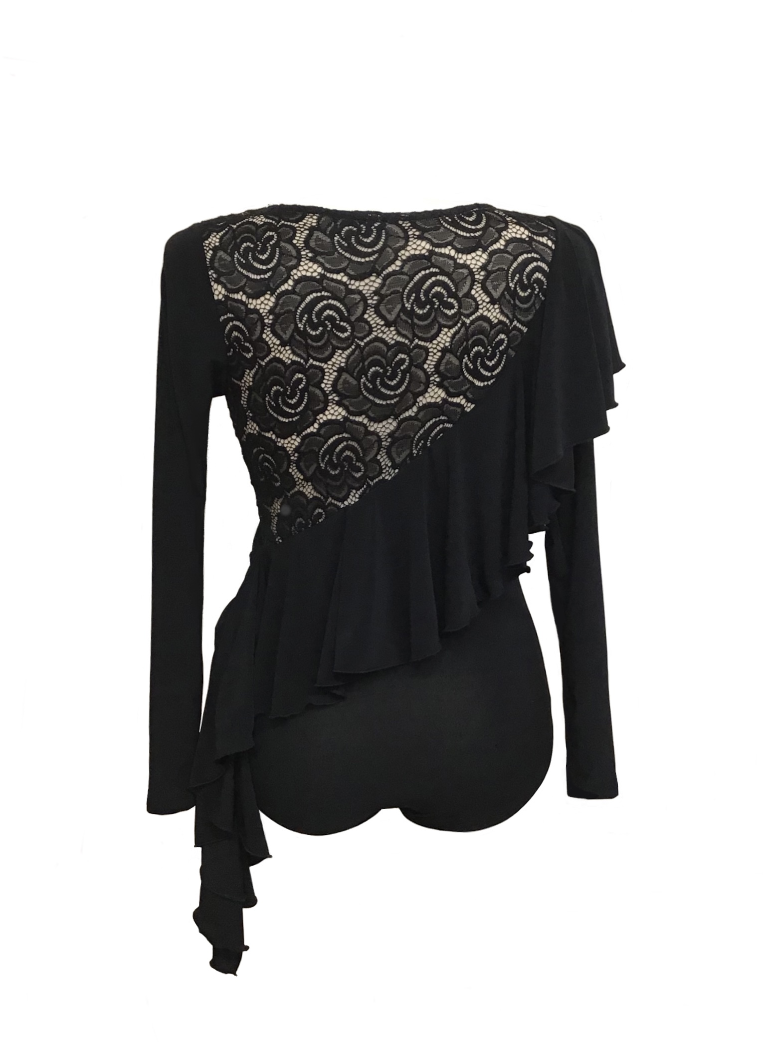 Stretchy Flamenco style shirt with Black lace front, Black/Black lace, XL Collar 17 inch, Chest 42 inch, Waist 36-40 inch