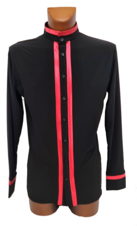 Black shirt with Red satin trim, size XL: Collar 17.5", Chest 42-44", Waist 38-40", Length 30"
